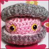Description: A little clam made of pink and grey yarn, peeking out of its shell with googly eyes.