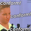 Description: Shot from MST3K short "Mr B. Natural," showing a white boy from the 50s, with "CONFORM!" superimposed several times.
